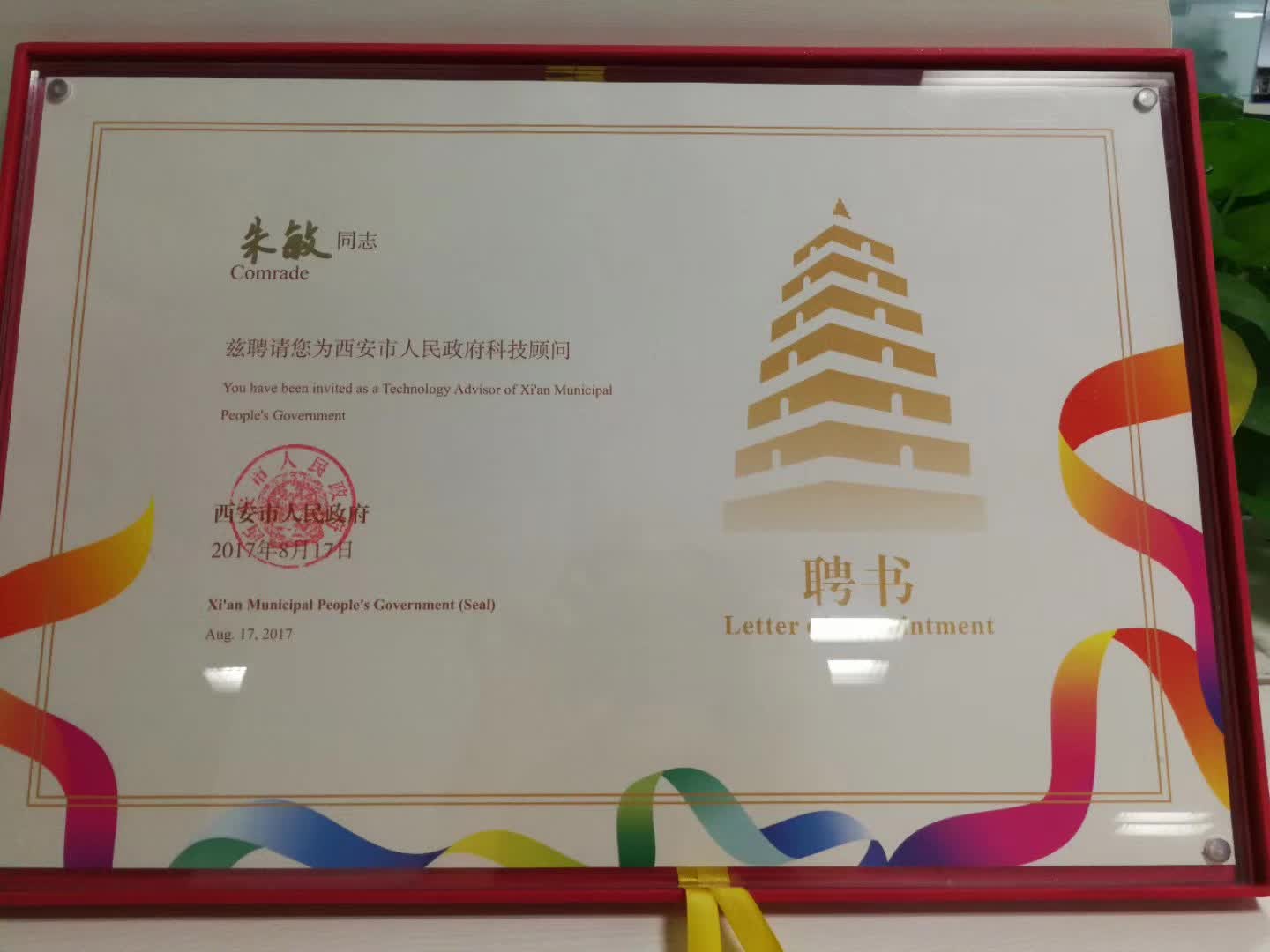陜西省委常委、西安市委書記王永康在簽約前會見了賽伯樂董事長朱敏,并為其頒發(fā)西安市人民政府科技顧問聘書。