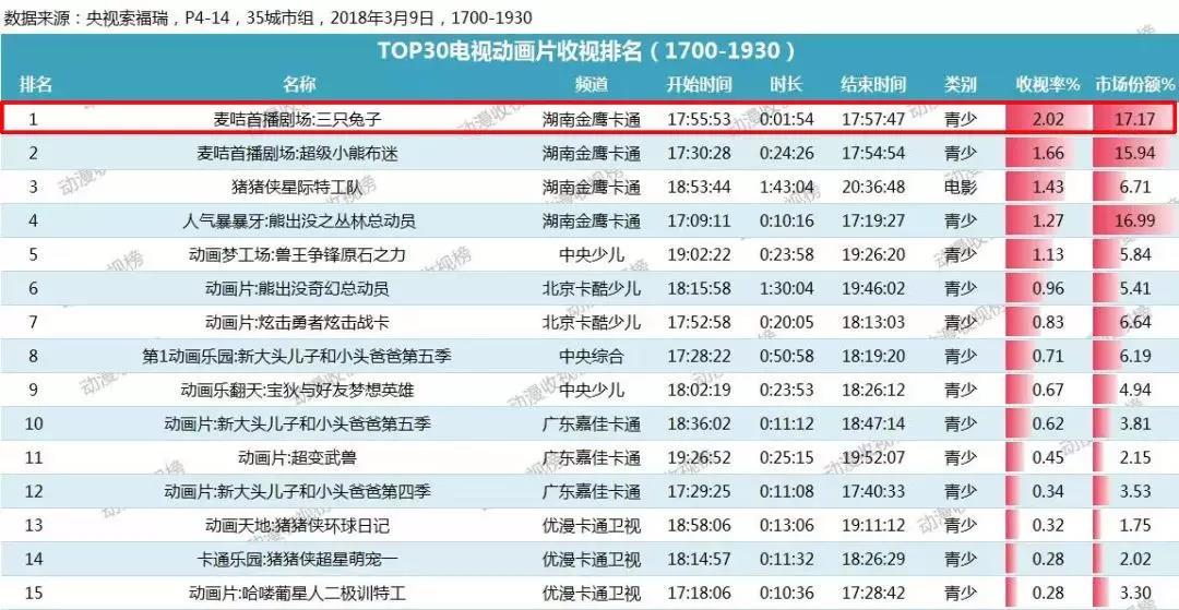 作為3月份新片,《三只兔子》(1-2部)在金鷹卡通衛(wèi)視的首播當(dāng)日就奮勇奪金,收視率超過(guò)2%,開(kāi)播一周表現(xiàn)突出。